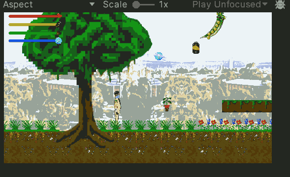 For the stage blocking I drew a series of sprites with a resolution of 64x64 pixel grids that were used for tiling the scene to add visual elements such as the ground, fillers of the scene (gaps, soil), water, plants, scriptable tiles for animation, and platforms. Regarding the background of the whole scene, I used empty gameObjects and children with a sprite renderer component to extend indefinitely, or at least a big enough, the horizontal scale of the background tile. Via the tiled drawing option in the sprite renderer component, I used two background images that had a sky aligned to give the impression of infinite scrolling. As the images have upper boundaries, I blended this colour to the camera background by copying the hexadecimal code of the image for a smoother transition into infinite sky. So the character is able to interact with the world I added a Tilemap collider 2D component to the drawn elements and used the composite collider so I could create an even surface to avoid odd collision detections, improve performance, and to reduce chances of character bugging. To provide extra challenge and visual aid to environment I wrote 2 scripts for platform horizontal and vertical movement. These scripts used the aid of the transform component and the Vector3 type of the position definition of the transform class to manage world movement.